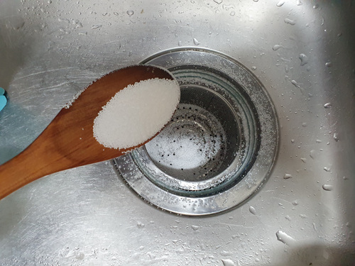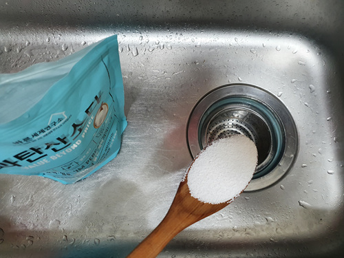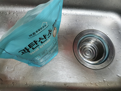 과탄산소다 1스푼을 싱크대 배수구에 넣은뒤 뜨거운 물을 부어줍니다. 아참, 과탄산소다 사용시 꼭 마스크착용 하시고요. 환기도 필수입니다.