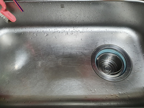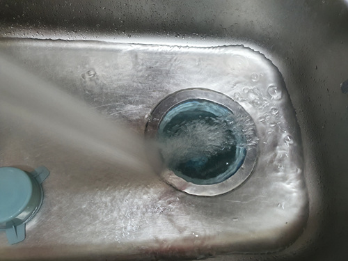 그럼 더 찌든때가 잘 지워집니다. 이 상태로 10분 정도 둔뒤 물로 깨끗이 씻어 줍니다. 물을 부어주면 배수구 구멍이 막혀 있어서 물이 싱크대에 남겨지는 것을 볼수 있어요. 그만큼 구멍이 잘 막힌 상태라는거 ..