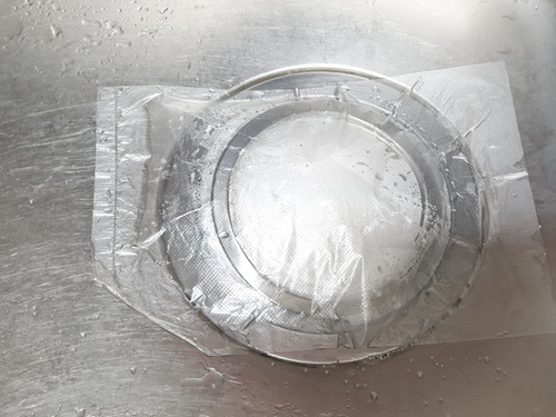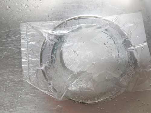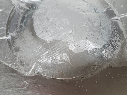 뜨거운 물을 부으면 보글보글 과탄산소다 끓어요. 그럴때 1회용 비닐백 하나 덮어주세요.