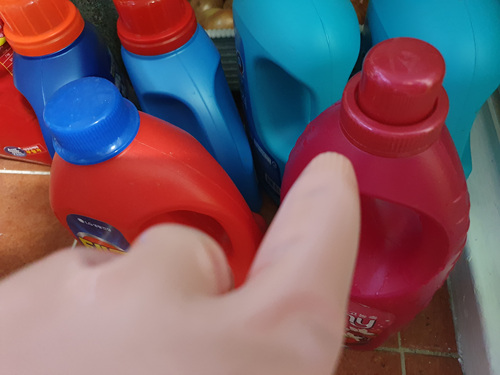 평소 사용하는 섬유유연제입니다. 색깔별로 구입했는데 이번에 하늘색 섬유유연제를 다 사용해 뚜껑을 청소용으로 이용했죠.