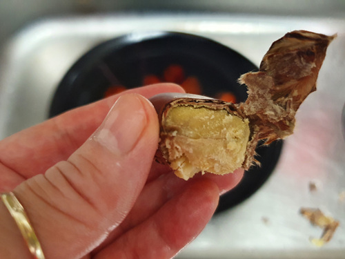 밤을 다 찐 후엔 뜨거울때 바로 드시지 말고 찬물에 조금 담근 뒤에 드시면 손으로도 쉽게 밤껍질을 벗겨 드실 수 있습니다.