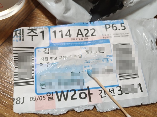 면봉에 손소독제를 묻혀 택배 스티커에 있는 중요 개인정보를 믈질러서 지워줍니다.