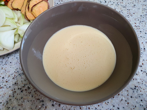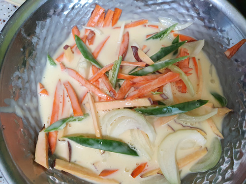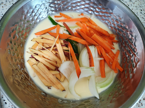 튀김가루를 넣으면 더 맛있겠지만 중력분이나 박력분도 상관없이 튀김을 할수 있습니다. 전 중력분 사용했습니다. 중력분 + 얼음물 + 달걀노른자 섞어 반죽했어요. 반죽은 너무 되직하게 말고 젓가락에 묻혔을때 천천히 흘러 내릴 정도면 적당해요.