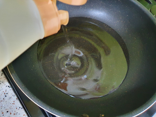 튀김 하기 전 후라이팬을 먼저 예열한 뒤 적당량 기름을 부어 주고 열이 오를때까지 기다립니다.