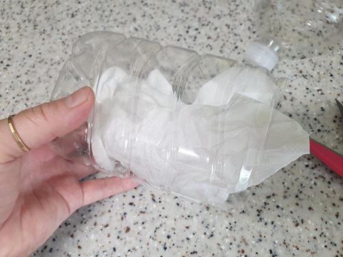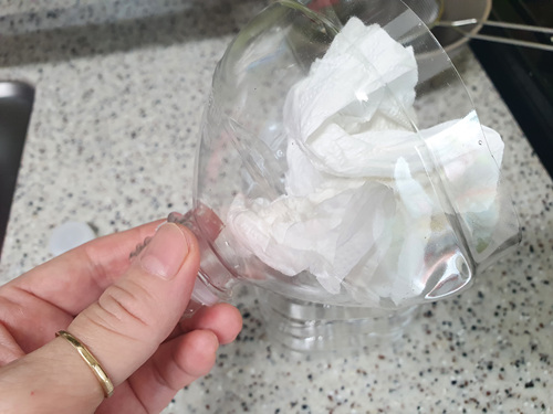 페트병을 자른 뒤에는 키친타월로 물기를 잘 닦아 주세요.
