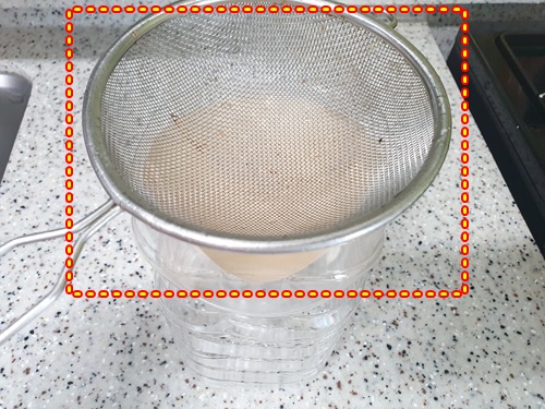 여기서 한가지 더.....이게 사실 키 포인트이긴 해요. 촘촘한 망을 위에 올려 주는거....... 그럼 튀김용 기름을 거를때 무거운 찌꺼기가 망에 걸러지기 때문입니다.