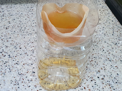 망에 한 번 걸러도 깨끗해 보이는 기름이지만 종이필터에 한 번 더 걸러주니 더 깨끗한 기름이 됩니다.