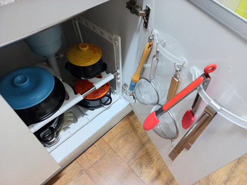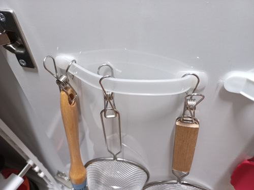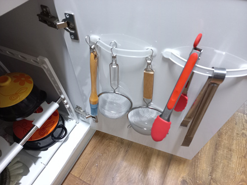 저는 집게, 망, 솔등을 걸어 두었어요. 자주 사용하진 않지만 꼭 필요한 것인데요. 설거지 후 그릇과 함께 두기엔 너무 자리를 많이 차지하기에 전 이렇게 보관하고 있습니다.