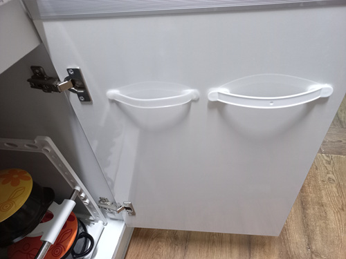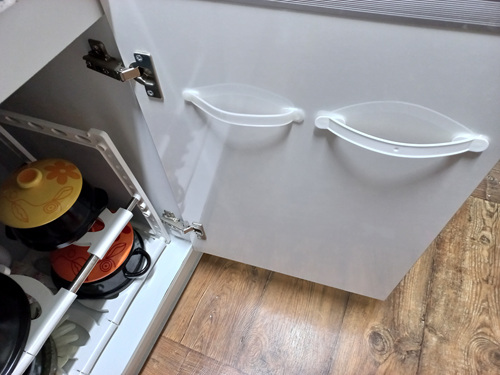 싱크대 아래 문을 열면 한쪽 면에 박스 손잡이를 붙여 줄겁니다. 두 개니까 간격을 두고 깔끔하게...