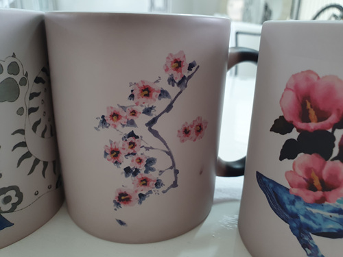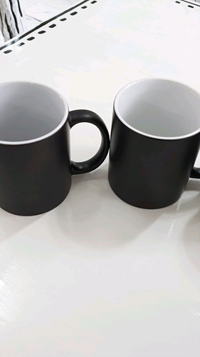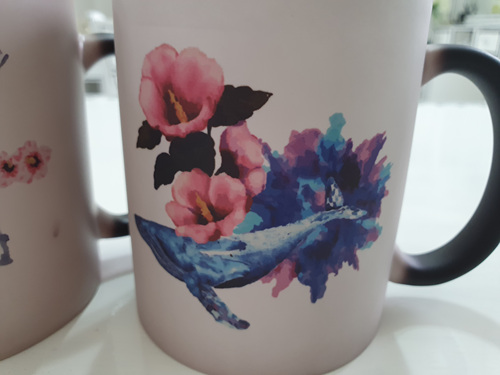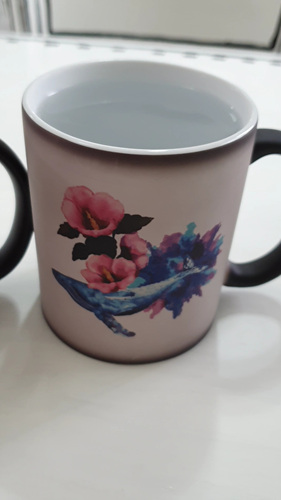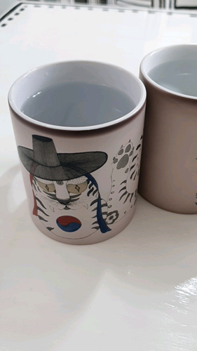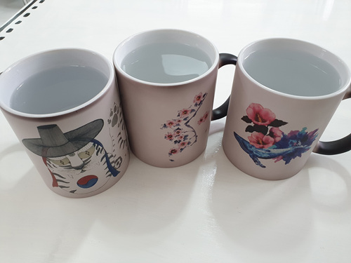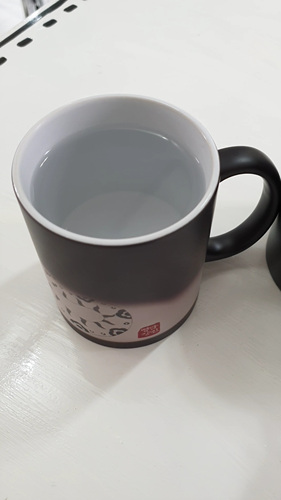 원래 검정색 머그컵인데 따뜻한 물을 넣으면 멋진 그림이 나타납니다.