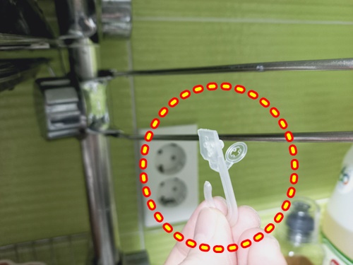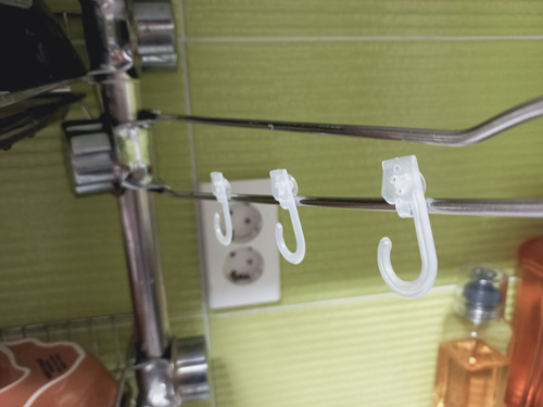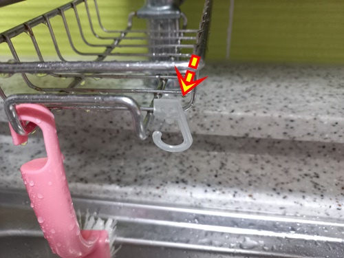 선반 아래에 이렇게 걸어 두면 싱크대 배수구 뚜껑을 걸어 두기도 좋아요. 설거지를 할때 은근 뚜껑이 거추장스럽잖아요.