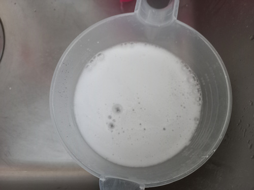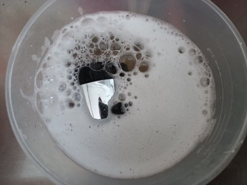 싱크대 수전을 세척할때는 필요한 것이 있는데요. 과탄산소다와 뜨거운 물입니다. 과탄산소다 1큰술에 물 500ml 정도 섞어 주세요. 물은 꼭 뜨거운 물을 사용해야 합니다.