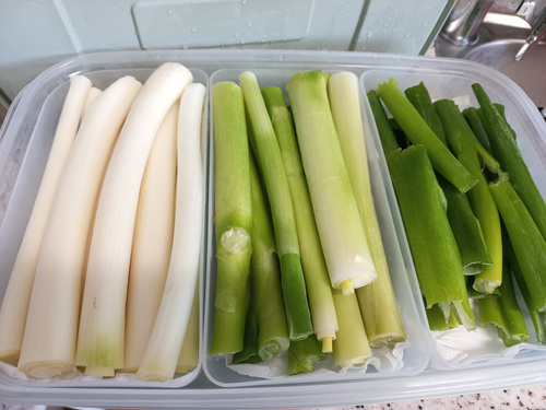 파의 흰부분, 중간, 끝부분을 나눠 담았어요. 이렇게 담아두면 필요한 부분만 골라 사용하기 쉬워요.
