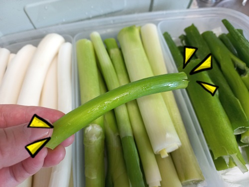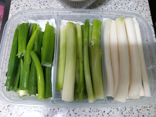 파의 흰부분, 중간, 끝부분을 나눠 담았어요. 이렇게 담아두면 필요한 부분만 골라 사용하기 쉬워요.
