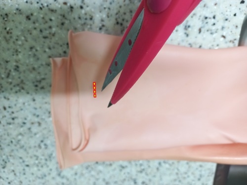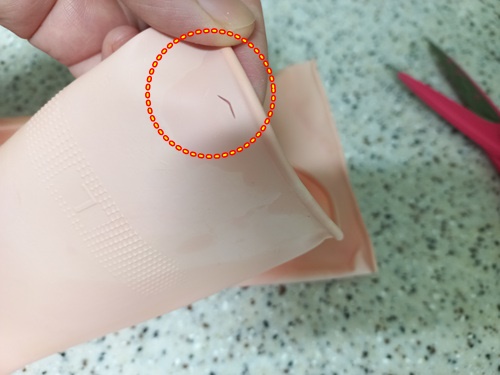 고무장갑 윗쪽 부분에 작은 구멍을 내어 주세요. 마스크걸이가 들어갈 크기면 충분합니다.