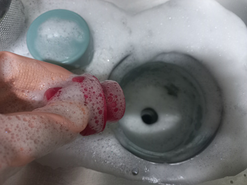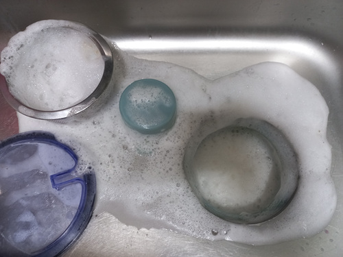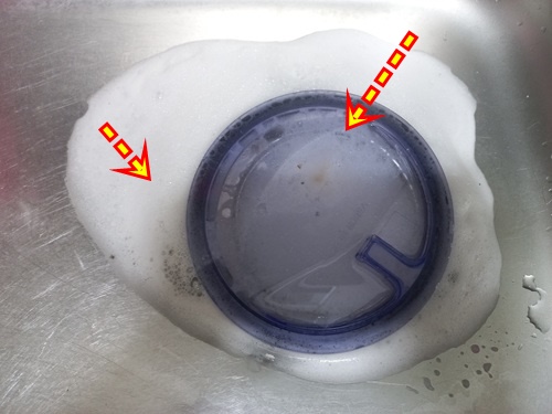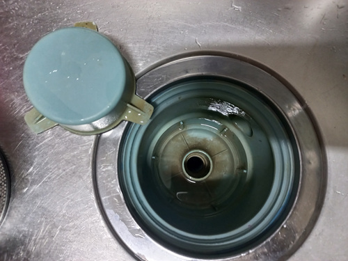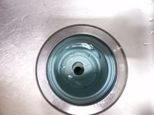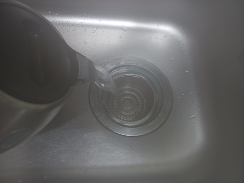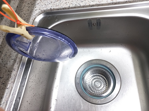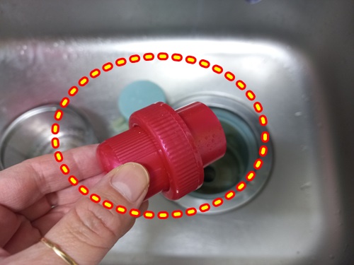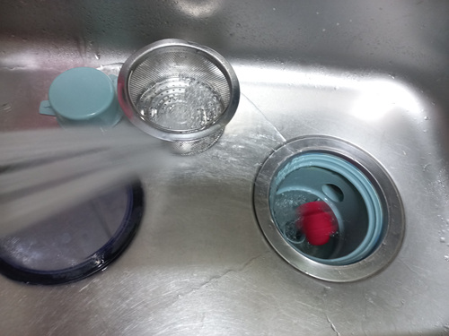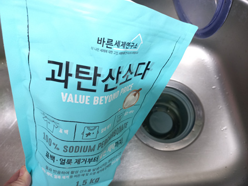 보통 물구멍을 막지 않고 과탄산소다를 넣어 청소하다 보면 뜨거운 물을 붓자마자 과탄산소다가 그냥 다 내려가 청소가 깨끗이 안 되는 단점이 있지요. 그 부분을 해결한 셈입니다.