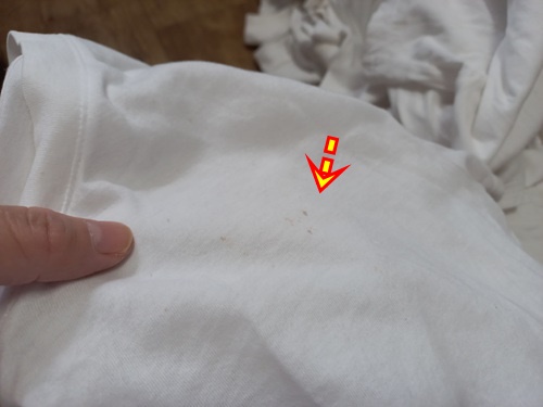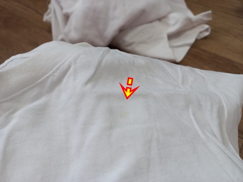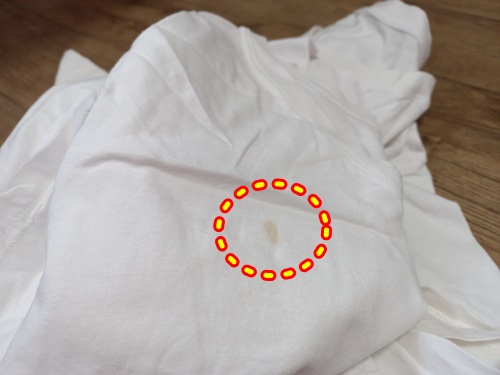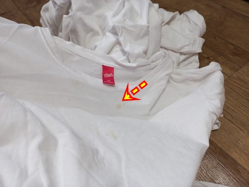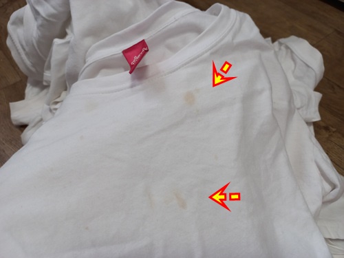 과일얼룩, 땀얼룩 등 흰면티에 하나 둘씩 자국이 생겨 있네요. 이런 얼룩은 사실 세탁기에 돌리는 것만으로는 해결이 안되는 것 같아요.