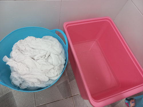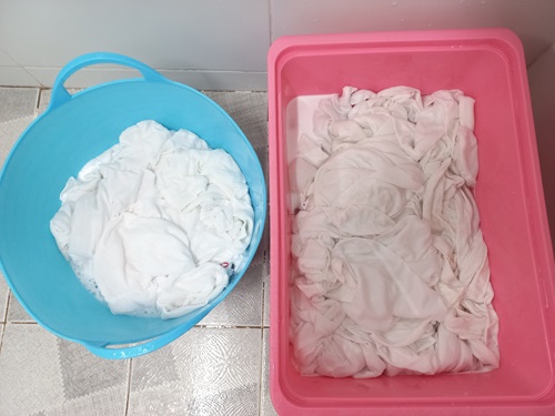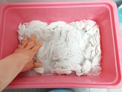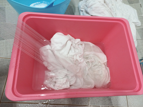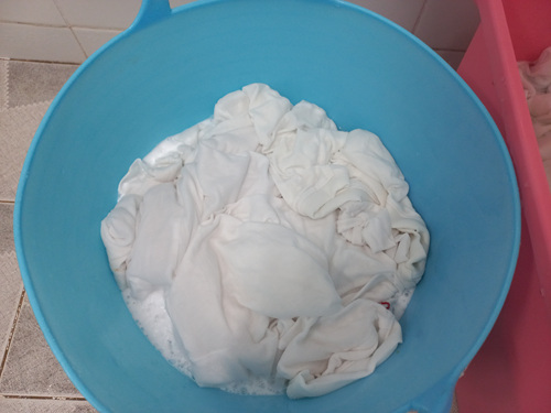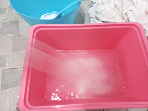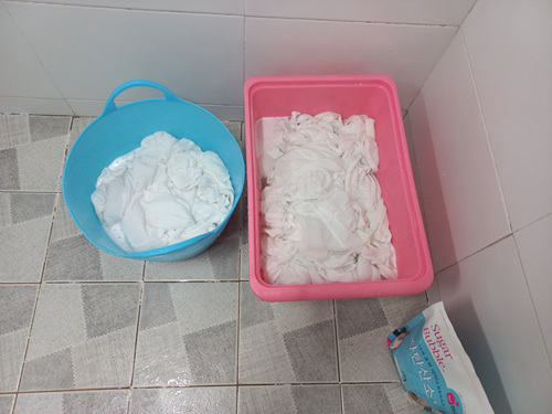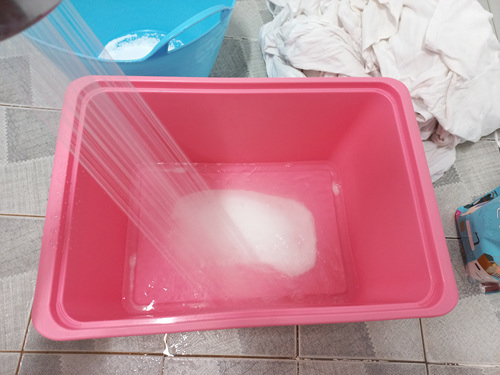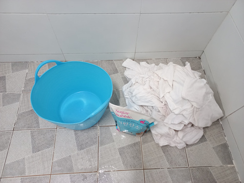 30분 담궈 뒀던 세탁물을 조물조물 한 번 씻어 주세요. 예전에 세탁기로 한 번 세탁한 것이기에 얼룩이 있었던 부분만 문질러 주면 됩니다. 물론 한 번 이렇게 과탄산소다물에 담궈 둔 상태가 되면 얼룩은 이미 저 세상으로 사라진 상태이지만요.