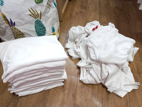 오늘은 여름철 많이 입어서 얼룩덜룩 한 흰면티 새하얗게 세탁해 보겠습니다. 먼저 깨끗한 흰면티와 분리를 한 후 얼룩이 생긴 것만 모아서 세탁하려구요.