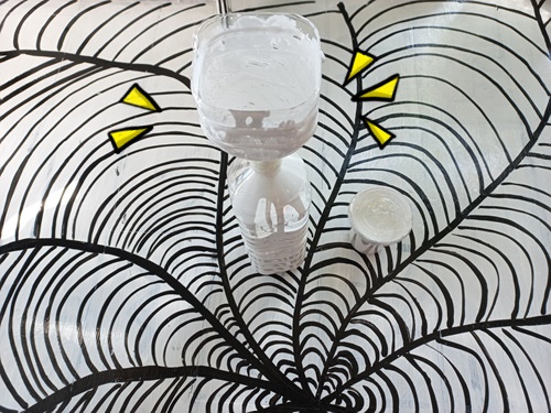 남은 페인트를 페트병에 담으려니 입구가 상당히 좁아 넣기 어려울 것 같지만 이 또한 제주살이 6년 차 스스로 터득한 저만의 팁이 있지요. 페인트를 담을 페트병 하나와 또 다른 페트병이 필요한데요. 하나의 페트병을 페인트가 들어가기 쉽게 자른 뒤 담을 페트병 입구와 맞물리게 테이프로 꽁꽁 묶어 줍니다. 이렇게 하면 페인트를 쉽게 입구가 좁아 어려웠던 페트병에 쉽게 넣을 수 있지요.