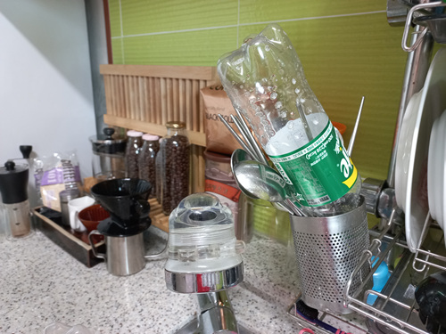 평소 수저통에 살짝 엎어두는 편인데.. 이젠 싱크대에 부착해 놓은 젓가락에 꽂아 두고 페트병 물기를 제거해요.