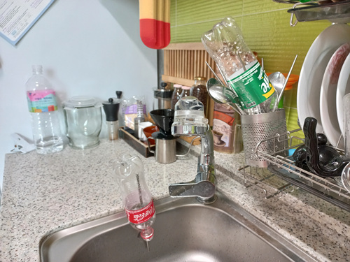 평소 수저통에 살짝 엎어두는 편인데.. 이젠 싱크대에 부착해 놓은 젓가락에 꽂아 두고 페트병 물기를 제거해요.