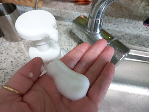 보통 손세정제를 사용하면 이렇게 거품형식으로 나옵니다. 처음 손세정제를 접할때 남편이 이런 말을 했지요.