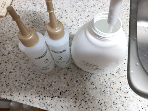 ' 퍼머하고 2제 뿌릴때 약이 줄줄 흘러 내리니까 세정제 빈통에 넣어서 사용해 보자 '고 권했습니다. 음....이게 가능할까? 조금은 의구심이 들었습니다. 하지만 남편의 생각은 적중했지요.