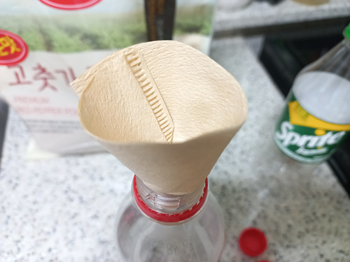 고추가루를 작은 입구에 넣을때는 종이필터나 종이호일을 깔대기 모양으로 만들어 사용하면 편리해요.