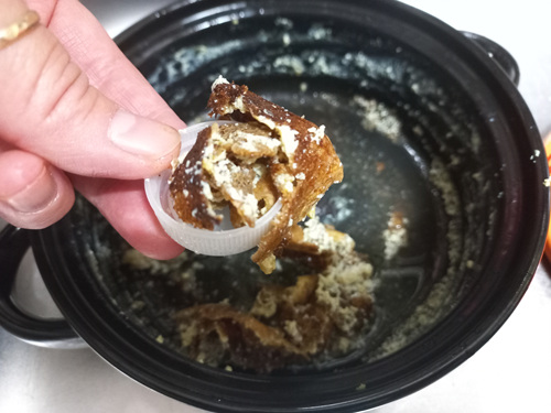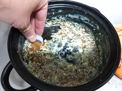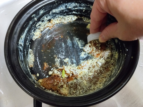 찬물이든 따뜻한 물에 한 1분 정도 불린 뒤 물을 버리고 페트병 뚜껑으로 눌어 붙어 있는 밑바닥을 살살 긁어주면 순식간에 눌어 붙어 있던 달걀이 제거됩니다. 물론 뚝배기에 흠도 생기지 않고 말이죠.