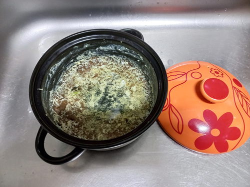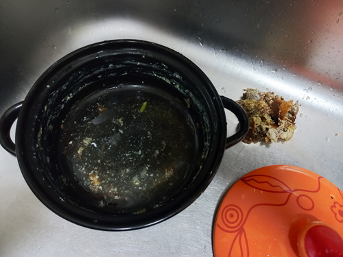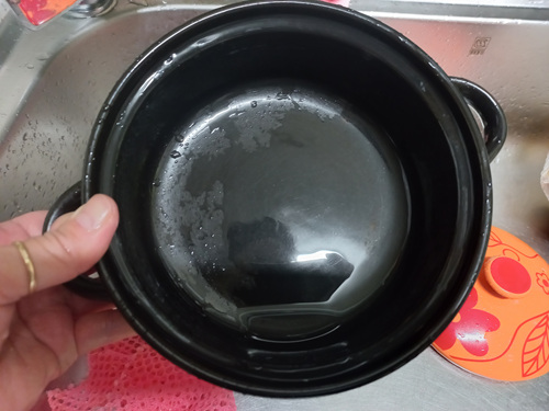 마지막까지 깨끗이 긁어 낸 뒤 부드러운 수세미를 이용해 한 번 더 설거지를 하면 깨끗한 뚝배기로 탈바꿈하지요.
