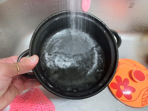 마지막까지 깨끗이 긁어 낸 뒤 부드러운 수세미를 이용해 한 번 더 설거지를 하면 깨끗한 뚝배기로 탈바꿈하지요.
