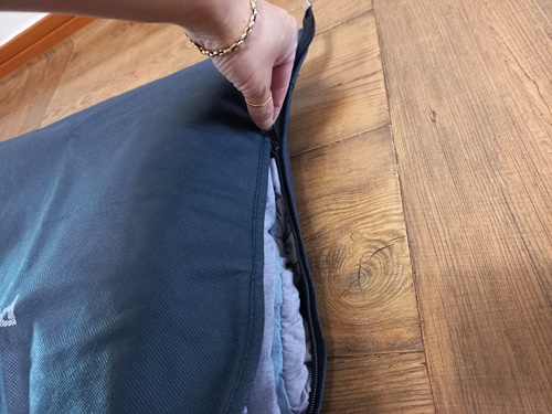 이불을 정장 더스트백에 맞게 잘 개어 준 뒤 올려서 지퍼를 잠궈 주기만 하면 이불 보관할때 완전 딱입니다.