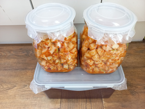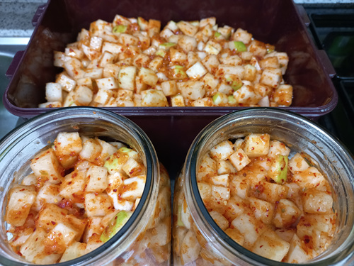 깍두기를 담근 뒤엔 실온에서 약 이틀 정도 둔 뒤 냉장고에 넣으면 더 맛있는 깍두기가 됩니다.