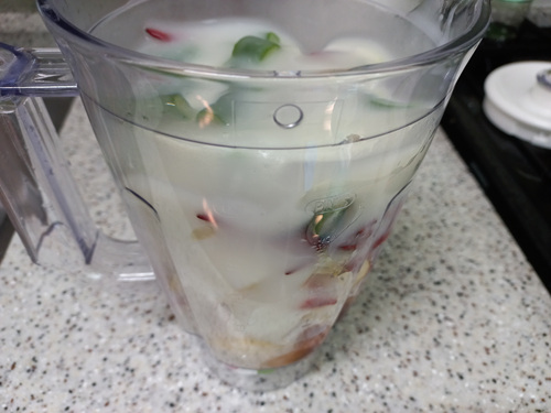 김치 양념에 들어가는 재료는 마늘, 양파, 사과, 고추, 찹쌀풀, 고추가루, 생강, 소금 , 설탕, 젓갈등이 들어갑니다. 다른 양념은 다 섞어서 믹서기를 돌리고 고추가루는 농도에 맞게 조금씩 넣어 돌려요.