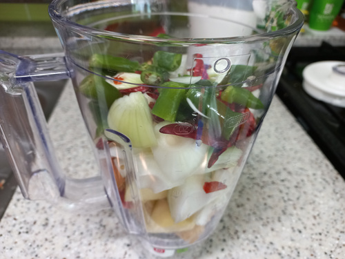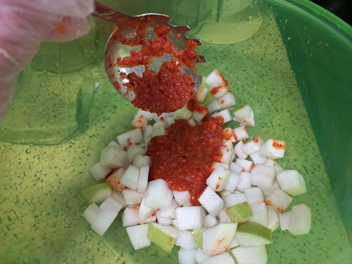 김치 양념에 들어가는 재료는 마늘, 양파, 사과, 고추, 찹쌀풀, 고추가루, 생강, 소금 , 설탕, 젓갈등이 들어갑니다. 다른 양념은 다 섞어서 믹서기를 돌리고 고추가루는 농도에 맞게 조금씩 넣어 돌려요.