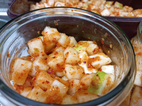 무 다발을 구입해서 무 4개로 담근 깍두기입니다. 양이 생각보다 많아서 이번 겨울내내 먹을 수 있을 것 같아요.