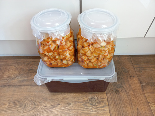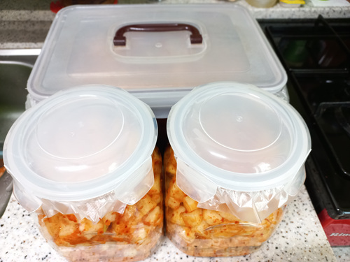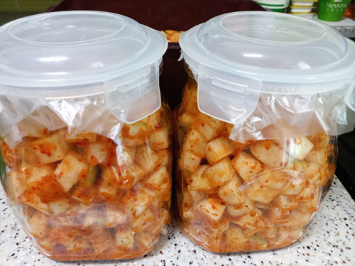 깍두기를 담근 뒤엔 실온에서 약 이틀 정도 둔 뒤 냉장고에 넣으면 더 맛있는 깍두기가 됩니다.