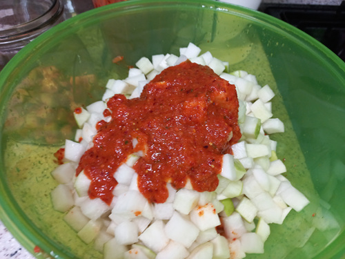 김치 양념은 몇 그램씩 정량으로 해야 하지만 이번엔 간단히 눈 대중으로 양념을 했습니다. 자주 김치를 담궈 먹어서 그런지 대충해도 간이 잘 맞더라고요. ㅎㅎ
