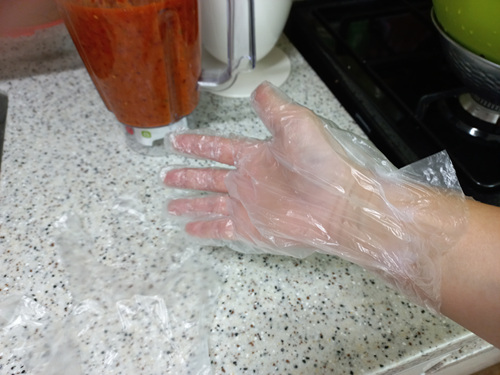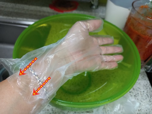 여기서 잠깐! 생활 속 팁 하나 들어갑니다. 전 깍두기를 양념에 무칠때 1회용 비닐장갑을 사용하는데요. 이때 비닐장갑이 손목까지 확실히 덮히지 않고 벗겨질때가 많죠. 전 그런 불편한 점을 해결해 보기로 했지요.1회용 비닐장갑 입구를 손으로 길게 늘리면 간단히 해결되는데요. 이때 살살 늘려 주셔야 해요. 그럼 길게 손목을 다 가릴 수 있고 비닐장갑이 잘 벗겨지지도 않습니다.