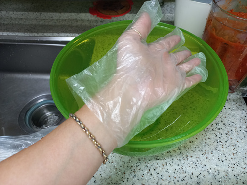 보통은 이런 모습인데 사용하기 불편하셨죠..이제 1회용 비닐장갑 입구를 조금 늘려서 사용해 보세요. 엄청 편하실거예요.