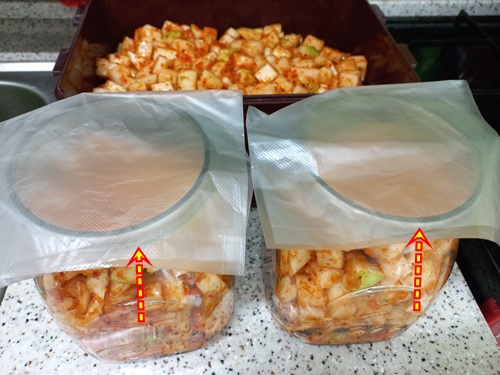 그리고 여기서 두번째 생활 속 팁 들어갑니다. 김치뚜껑을 아무리 잘 닫아도 냉장고에 넣어 두다 보면 김치냄새가 나기 마련인데요. 이럴때 유용한 정보예요. 김치뚜껑을 닫기 전에 1회용 비낼백으로 먼저 덮은 뒤 뚜껑을 닫으면 김치냄새가 전혀 나지 않아요.