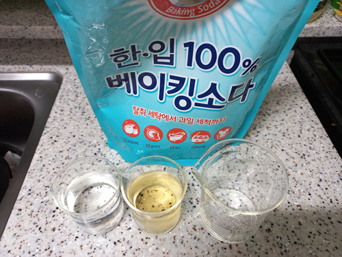 주방세제가 없다면? 이렇게 해 보세요. 먼저 준비할 것은 베이킹소다, 물, 식초입니다.