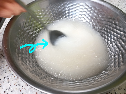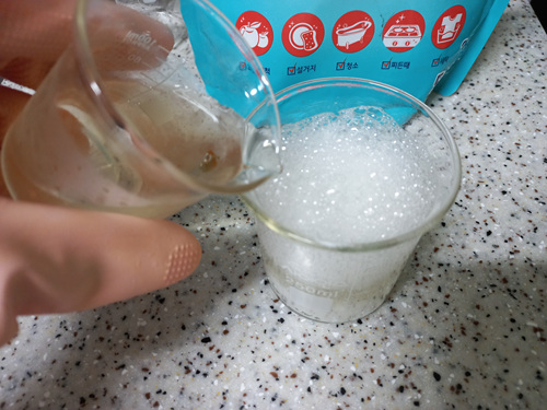 요렇게 다 섞었다면 숟가락을 이용해 베이킹소다가 잘 녹게 섞어 주세요. 완전히 섞이지 않아도 설거지 하는데 문제없지만 덩어리가 생길 수 있으니 섞는게 좋아요.