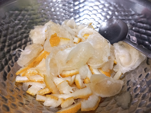 참고로 과육은 숟가락을 이용하면 쉽게 분리되고 씨앗도 빼기 쉽습니다. 씨앗을 분리해야 유자청을 담았을때 쓴맛이 없답니다.