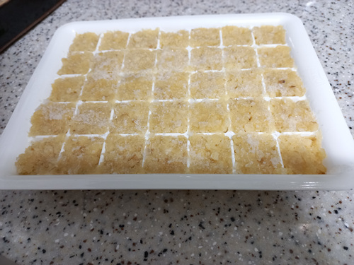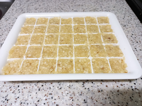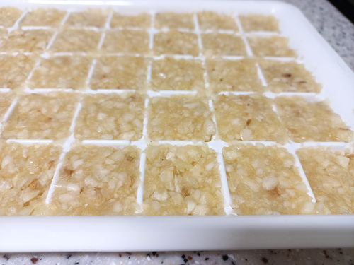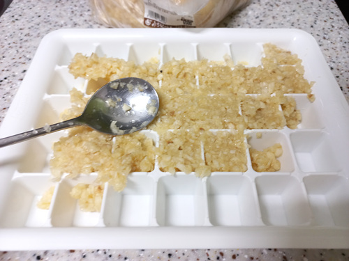 얼음틀이 준비되었다면 숟가락을 이용해 간마늘을 얼음틀에 옮겨 담은 뒤 평평하게 펴 주세요.