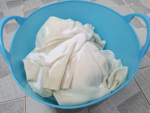 먼저 초벌빨래를 해줍니다. 과탄산소다에 따뜻한물을 섞어서 담궈두기만 해도 자연스럽게 초벌빨래가 됩니다.