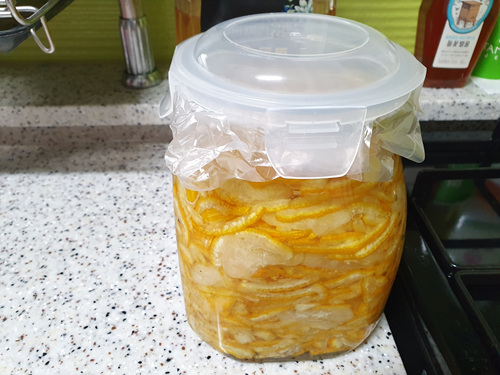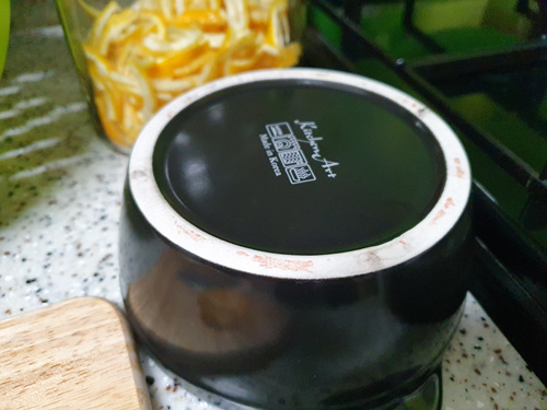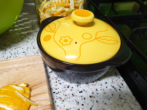 무딘 칼로 처음엔 조금 힘들게 유자를 썰었는데 뚝배기 뒷면에 몇 초 갈았더니 이내 새 칼처럼 편하게 유자청을 빨리 완성 했네요. 집에 칼가는 기계가 없다면 임시방편으로 뚝배기 활용해 보세요. ^^
