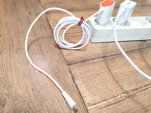 충전기 줄은 길어서 지저분해져 보이기 때문에 그 부분만 잘 해결하면 되는데요. 휴대폰 충전할 수 있는 길이까지 둔 채 깔끔하게 말아서 빵끈으로 묶어 줍니다. 이때 너무 세게 묶지 말고 정리만 될 정도로만 묶어 줍니다.