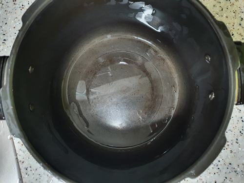 팔팔 끓인 물 그대로 압력밥솥을 닦으면 순식간에 새까맣게 탄게 지워집니다. 완전히 탄 냄비도 문제없으니 꼭 따라해 보세요. 참고로 너무 많이 탔을땐 3M 수세미로 닦으면 쉽게 설거지가 가능해요.